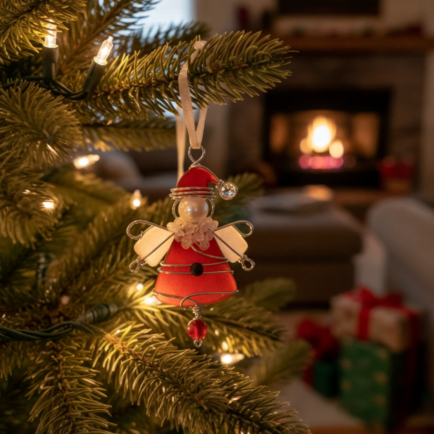 A cheerful angel crafted with ocean-washed glass and festive details. It brings a soft, joyful glow—perfect for the centerpiece of your tree.