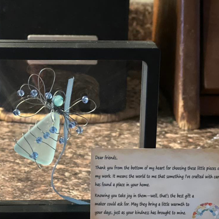Each angel is lovingly made from genuine sea glass, naturally tumbled by the ocean and hand-wrapped with delicate silver wire to form graceful wings and a halo.