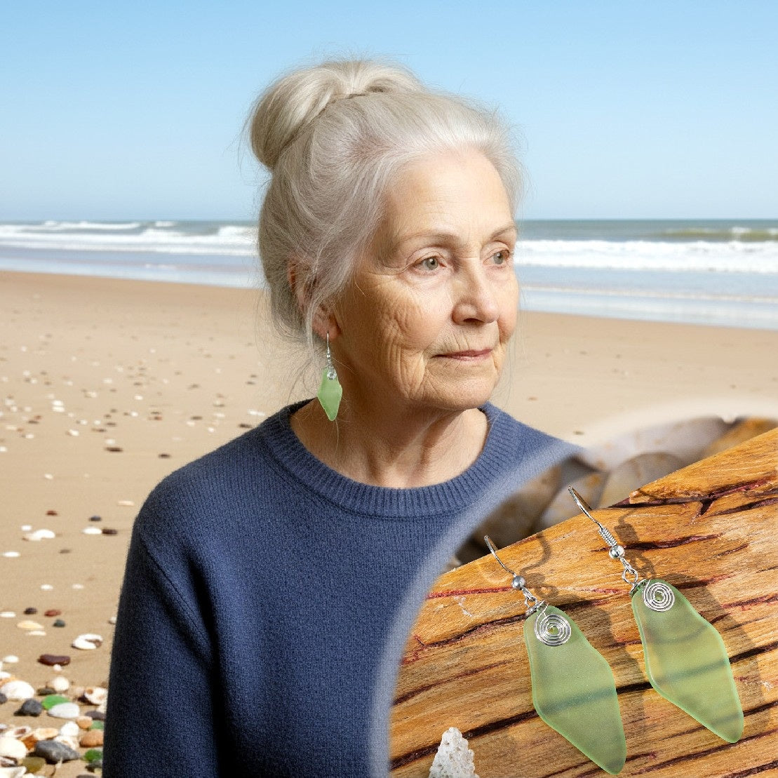 The sterling silver settings elegantly frame the sea glass, enhancing its natural beauty while providing a secure and comfortable fit.